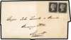 1840 mourning entire letter franked by two 1d blacks Plate 1a (LB & LE), both four good margins, lightly tied by faint strikes from red MC, backstamped by Fareham d/s for MY 21, slight ageing to entire, otherwise fine, attractive and scarce May Date usage. SG 2; Spec A1(2)th priced £2500 for single on cover.