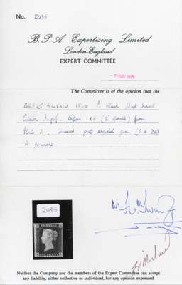 GB: 1840 1d black Plate 2 (KE) BPA certificate (1979) four margins, unused part o.g.