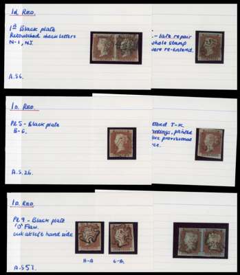 1840 1d black selection of all twelve plates, 1A to 12, all with four margins some a little close, plate 8 matched with 1d red; also a selection of 1d reds from black plates with 1B (pair), 5 (3), 9 (2) and 10 (pair), all with four margins. Condition variable. (22). SG 1-3, 7