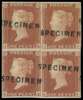 GB SG8var 1841 1d Red-brown Pl.90 SPECIMEN Block of four.