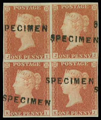 1841 1d Red brown Pl.90. A superb unmounted o.g. four margin block of four lettered JI-KJ, overprinted "SPECIMEN" type 1. An exceptional multiple. SG 8s, £8,000 as singles.