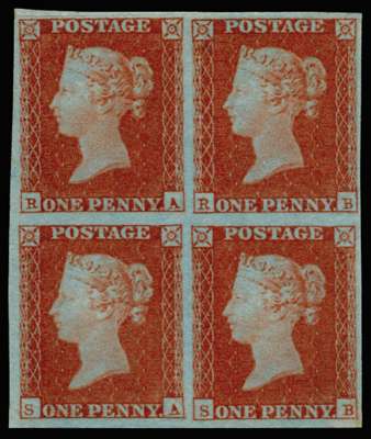 1841 1d Red-brown Pl.112. Superb unused large part o.g. block of four. Top pair very lightly mounted and lower pair unmounted. Extremely fresh block, seldom seen. Spec BS32.