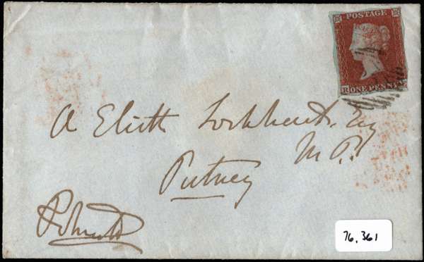 GB SG8 1852 1d Red brown Pl.154 "Treasury" roulette on cover