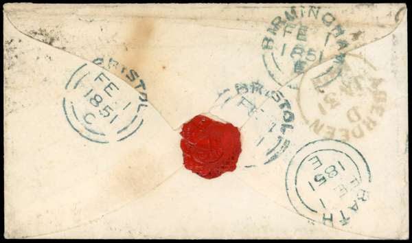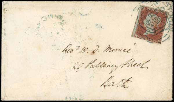 1841 1d Red-brown. Envelope bearing 1841 imperforate re-brown (SG8, QD) margins at left and top. Sent from Aberdeen JA.31.1851 via Birmingham FE.1.1851 to Bath, remaining uncancelled. Cancelled by three BRISTOL FE.1.1851 datestamps in blue. Further two on the reverse. Most unusual, some small faults but an attractive mailing.