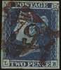 1841 2d Blue Pl.4. Very fine used close to good four margin example lettered LB, cancelled by a Drogheda "179" Irish numeral in reddish-purple. Minute tone spot in NE corner square nevertheless a truly spectacular example of this very rare cancellation, the finest example we have handled in well over a decade. Spec. ES14wc. 1995 BPA Cert. Cat. £20,000.