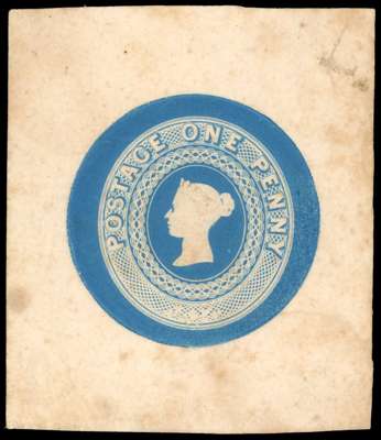 c. 1840 William Wyon embossed essay printed in blue on card (57x65mm) with manuscript annotation on reverse. Slight staining and a crease clear of the design. Scarce. Priced at £1,200+ in QV Vol I Part I (pg. 15)