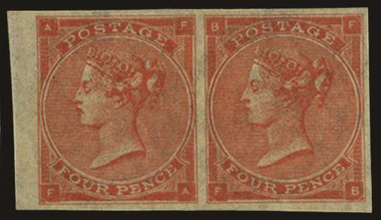 1863 4d Pale red Pl.4 (Hair lines). Superb unused o.g. left hand marginal imperforate horizontal pair lettered FA-FB. Very scarce so fine. Spec. J53(2)d, £4,800.