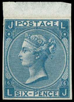 1865 6d Colour trial Pl.6. Very fine unused o.g. imperforate colour trial lettered LJ, printed on thin wove unwatermarked, ungummed paper in blue. One of only three known in private hands. Taken from a presentation album for the 1867 Paris exhibition. 2007 RPS Cert, SG 97, £8,000