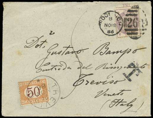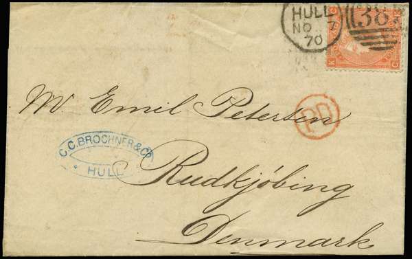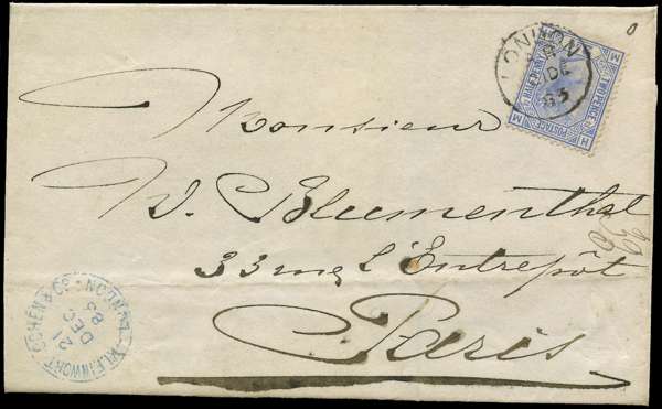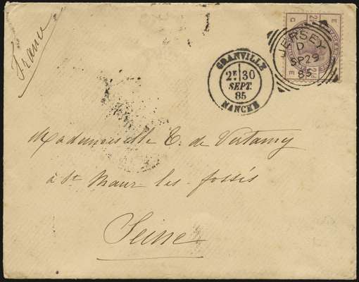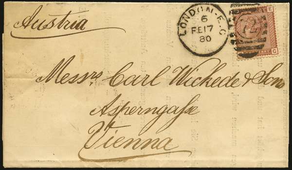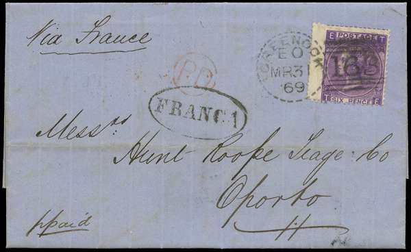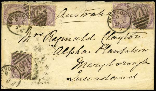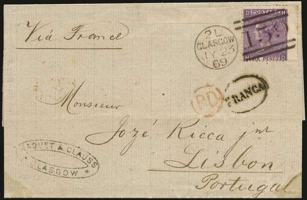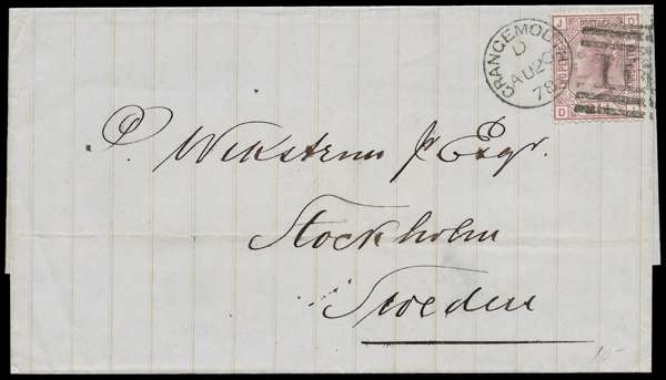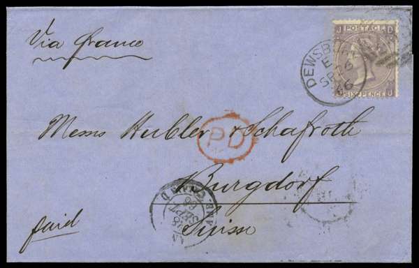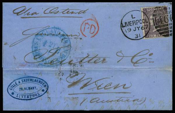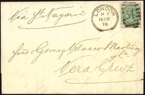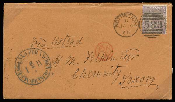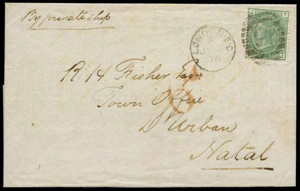 1866-86 overseas mail collection arranged on leaves including: 1866 cover to Chemnitz, Saxony, franked by 6d lilac Pl. 5 (SG 97) tied by Nottingham duplex for JA 4 66 and routed "Via Ostend" with blue Aachen transit cds for the 6th, complete with original contents, 1876 double rate cover to Durban, Natal endorsed "By private ship", franked by 1s green Pl. 12 (SG 150) and tied by London E.C. duplex for JU 5 76 with Durban receiver on reverse for AU 8 with a red "6d" accountancy handstamp indicating the colony's share of the postage, 1876 cover to Vera Cruz, Mexico, carried by French packet from St Nazaire, franked by 1s green Pl. 12 (SG 150) and tied by London duplex for 18 DE 76, 1884 double rate cover to Maryborough, Queensland franked by five 1d lilacs (SG 172) tied by Ventnor duplexes for JA 1 84 and backstamped by Brisbane/Queensland cds for FE 14 and faint Maryborough receiving cds. A fine group, well suited for the online retailer. (14)