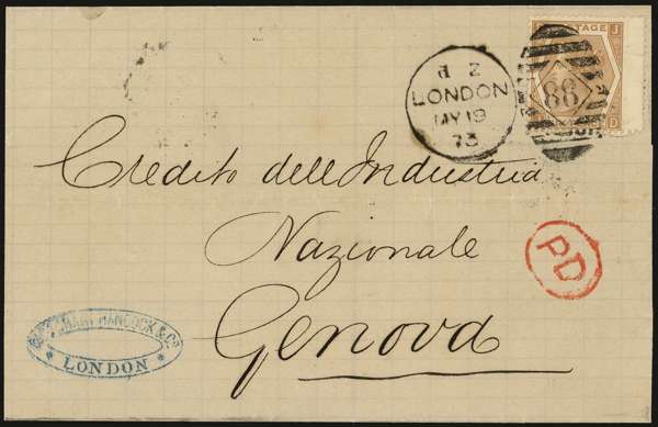 1873 6d Chestnut Pl.12. Very fine used right hand wing margin example, neatly tied to a clean entire to Genoa by a London '88' duplex for MY.19.1873. Genoa arrival datestamp on reverse for 23rd. A very attractive example of this rare 'abnormal' issue on cover. 2019 PTS Cert.