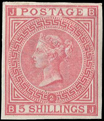 1874 5s Rose Pl.2. Very fine unused o.g. imperforate imprimatur lettered BJ. Very scarce one of only 21 possible examples, many of which are in institutional collections. SG 126var, £18,000.