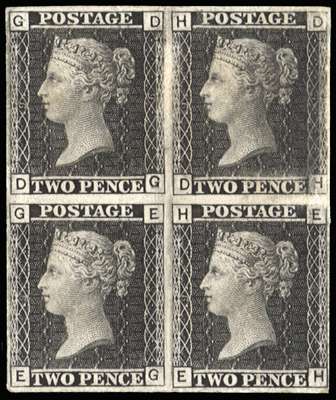1867 2d Paris Exhibition Proof Pl.9. Superb unused imperforate block of four lettered DG-EH, printed in black on soft white card. Very rare only one sheet of 240 printed. SG DP49, Cat: £12,000