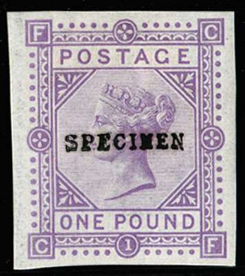 1878 £1 Colour trial Pl.1. Very fine unused o.g. imperforate example lettered CF. Printed in mauve on gummed watermarked paper overprinted "SPECIMEN" type 9. Scarce.
