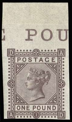1878 £1 Brown Lilac Pl.1. Exceptional fine and fresh unmounted o.g. top marginal imperforate imprimatur lettered AD showing part sheet inscription. Very rare only 24 examples have been removed from the imprimatur sheet, several of which are in institutional collections. 1980 BPA Cert, SG 129var, £45,000.