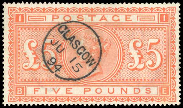 1867 £5 orange cancelled by neat central “GLASGOW/JU 15/94” cds, with Diena certificate (1988) fine used SG 137 £3,600