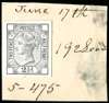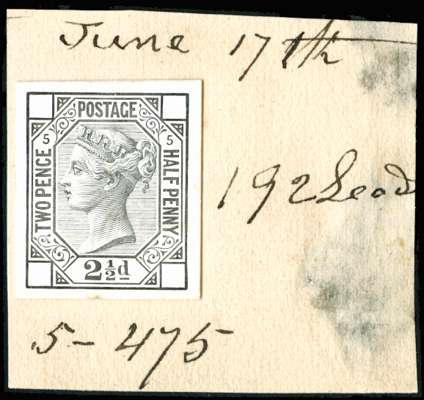 1876 2½d Die proof Pl.5. Very fine cut to size example printed in black on white glazed card with void corner squares, mounted on part DLR striking book page with manuscript annotations "June 17th/ 192 Leads/ 5-475". Unique. Ex. DLR Archives