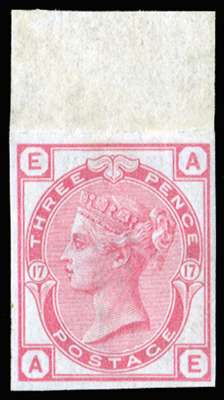 1875 3d Rose Pl.17. Very fine and fresh unused o.g. top marginal imperforate imprimatur lettered AE. Very scarce, one of only 22 possible example many of which are in institutional collections.