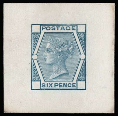 1873 6d Die proof. Very fine example printed in deep blue-green on white glazed card (37 x 38mm). Very rare only two or three examples of each colour are recorded.