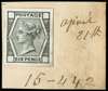 1874 6d Die proof Pl.15. Very fine cut to size example printed in black on white glazed card with void corner squares, mounted on part DLR striking book page with manuscript annotations "April-21st" & "15-442". A spectacular and unique piece. Ex. DLR Archives.