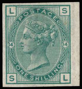 1876 1s Green Pl.14. Very fine unused o.g. imperforate imprimatur lettered SL. Very rare, one of only 21 possible examples of this rare "abnormal" issue, many of which are in institutional collections. SG 150var, £25,000.