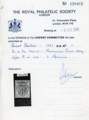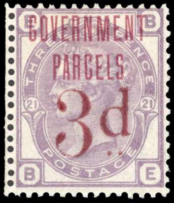 1883 3d on 3d lilac, Plate 21 (BE), “Government Parcels” essay, very fine unused o.g. example, with trial overprint Type B in red. Very rare, only six examples were produced. RPS cert (1981), SG 159var, £11,000