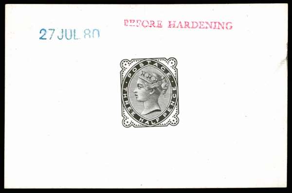 1880 1½d Die proof. Very fine proof printed in black on white glazed card (92 x 60mm) endorsed "BEFORE HARDENING" in red and dated "27 JUL 80" in blue. Scarce. Ex. "Verus".
