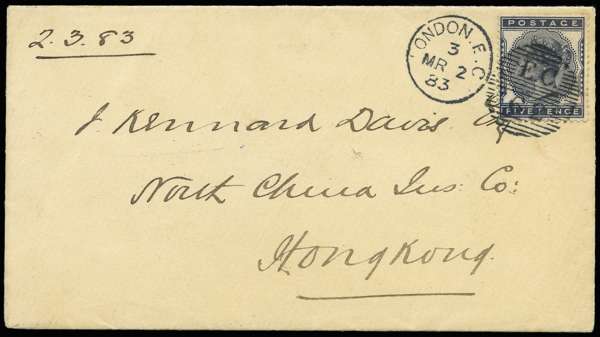 1883 Overseas mail. Very fine and fresh uncreased cover to Hong Kong bearing a London E.C. duplex for MR.2.1883, backstamped with a Hong Kong receiver for AP.8.1883. A most attractive and very fine destination item.