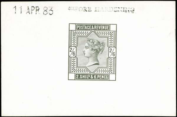 1883 2s6d Die proof. Very fine and fresh example printed in black on white glazed card (92 x 60mm), endorsed “BEFORE HARDENING“ and dated “11 APR 83“. Scarce