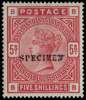 1884 5s Rose on blued paper. Very fine unused o.g. well centered example lettered BB overprinted "SPECIMEN" type 9. Spec. K11s. Scarce.
