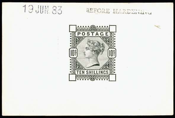 1883 10s Die proof. Very fine example printed in black on white glazed card (93 x 61mm), endorsed "BEFORE HARDENING" and dated "19 JUN 83". Scarce.