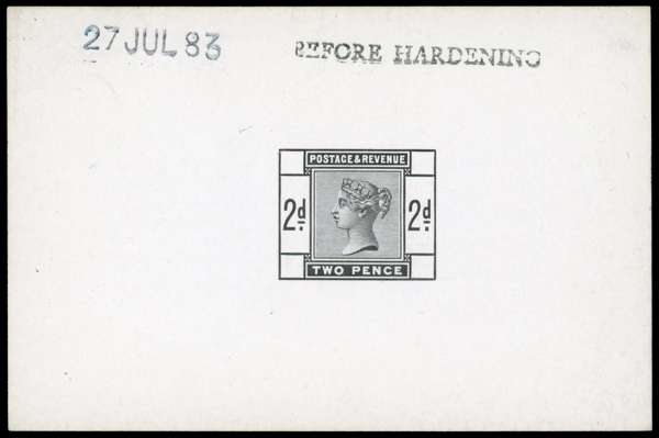 1883 2d die proof , without corner letters, in black on glazed card (92x60mm) endorsed ‘BEFORE HARDENING’ dated ‘27 JUL 83’, fine, scarce. SG 189var Ex ‘Verus’