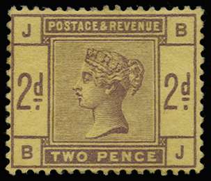 1884 2d Colour trial. Very fine unused o.g. perforated example lettered BJ, printed in purple on yellow, gummed, unwatermarked paper.
