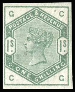 1884 1s Dull green. Very fine and fresh unused o.g. imperforate example lettered CG. Very rare. Spec. 2011 BPA Cert, Spec. K26a, £8,000.
