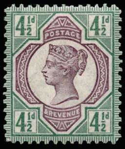 1892 4½d "Jubilee" Colour trial (Perf 14). Very fine and fresh unused perforated example printed on crown watermarked, gummed paper with the head plate in mauve and the duty plate in grey-green. Very scarce. Ex. "Verus".