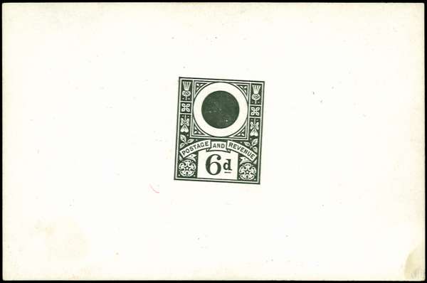 1884 6d Embossing essay die proof. Very fine example similar to the "Jubilee" design but without Queens's portrait and line under "d" of face value, printed in black without embossing on white glazed card. Very rare. See Specialised Vol.1 pg. 254 (Design Type A).