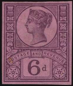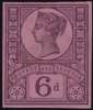 1887 6d "Jubilee" Colour Trial. Very fine imperforate colour trial printed in purple on pale purple, gummed, Crown watermarked paper. Rare. SG 208var, £7,000. Ex. 1976 DLR Archive Sale & "Aureum".
