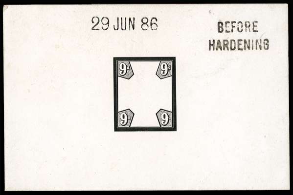 1886 9d Duty Plate Die Proof. Very fine duty plate proof printed in black on white glazed card (92 x 60mm) endorsed "BEFORE HARDENING" and dated "29 JUN 1886". Scarce. Ex. "Verus".