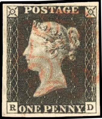 1840 1d black, plate 1A (RD), four margins, cancelled by red MC with expertising mark on reverse. SG 2