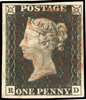 1840 1d black, plate 1A (RD), four margins, cancelled by red MC