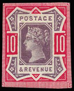 1890 10d Dull purple and carmine. Superb unused o.g. imperforate imprimatur. Extremely rare, only six stamps have been removed from the imprimatur sheet, all from pane H positions R.3/4,5 & 6 and R.4/4,5 and 6 of which this is R.3/3. Only four are now believed to exist in private hands of which at least one is torn. SG 210var, £35,000. Ex Shaida & Aureum.