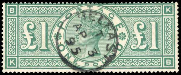 GB: 1891 £1 green cancelled with neat, central “BELFAST /AP 3/95” cds fine used SG 212