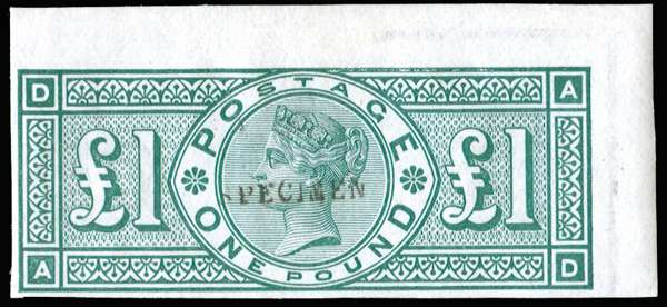1891 £1 Green. Very fine and fresh unused o.g. top right hand corner marginal example lettered AD, overprinted “SPECIMEN“ type 9. Couple of small paper adhesions on reverse nevertheless a very presentable example without any of the heavy creasing normally seen on these rare imperforates. Spec. K17s, £6,500.