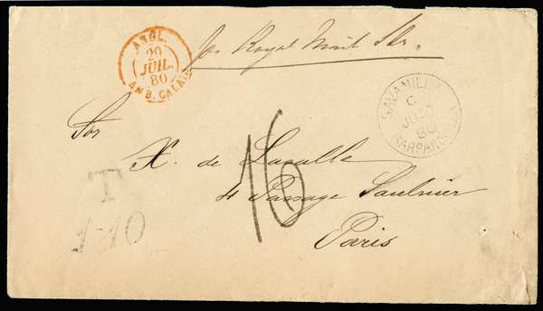 1880 British Post Offices Abroad. Very clean and fresh unpaid cover from Colombia to Paris, bearing a very fine strike of the BPO Savanilla/Barranquilla cds for JU.30.1880. Carried by Royal Mail steamer via London the cover shows a London transit cds on reverse for 28th July and a Calais transit cds for the 29th. Charged "16" decimes for delivery by the French Post Office with a "T/1-10" tax mark showing the share due to the British Post Office. An attractive cover from this very difficult overseas office.