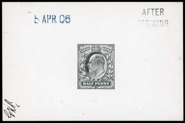 1902-10 ½d die proof in black on glazed card, (92x60mm) endorsed ‘AFTER STRIKING’ and dated ‘5 APR.06’ and initial in m/s at lower left, fine and scarce. SG 215var