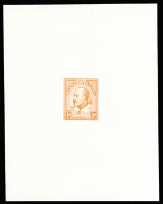 1903 1d Canada Head Essay Colour Trial (Die 2, large head). Superb unused example printed in pale orange on thick wove, plate glazed paper (87 x 107mm). Scarce. Ex. "Minoru".