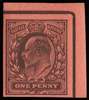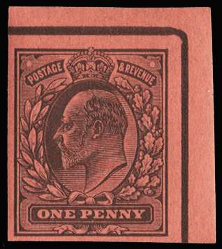 1902 1d Colour trial. Very fine unused o.g. imperforate corner marginal example printed in black on red Crown watermarked paper. Printed from a special plate of 20 electros. Scarce.