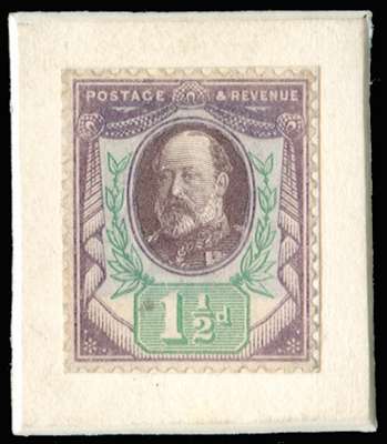 1901 1½d Composite “Paste Up“ essay of the Victorian “Jubilee“ series. A spectacular Series “A“ essay with a lithographed three-quarter face portrait of King Edward VII facing left, mounted on a stout white card tablet. A magnificent essay and exhibition piece, believed to be one of only two or three examples in private hands. 1980 RPS Cert.