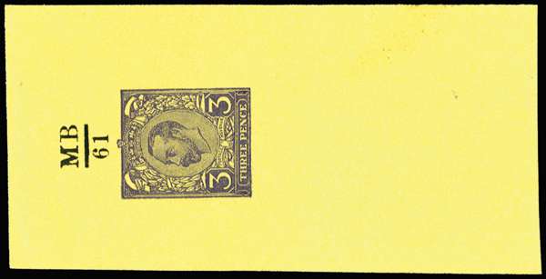 1910 3d Hentschel colour essay. Very fine example printed in purple on yellow wove paper (45 x 90mm) with handstruck “MB/61“ above design. Most attractive and scarce.