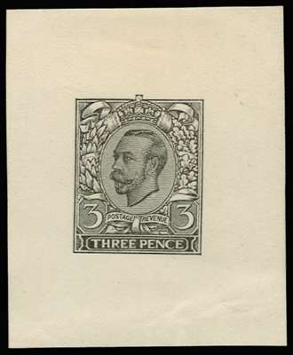 1911 3d Engravers Sketch Die for Unissued Value. Very fine fully cleared die proof printed in black on thick white proofing paper (41 x 50mm) with shaded background and shaded upper corners (Fig. 23). Scarce.