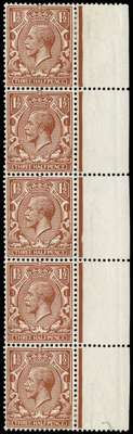 1912 1½d Red-brown (Wmk. Royal Cypher). Very fine unused o.g. right hand marginal vertical strip of five showing complete "POSTAGE" watermark. Spec. N18(1)yb.